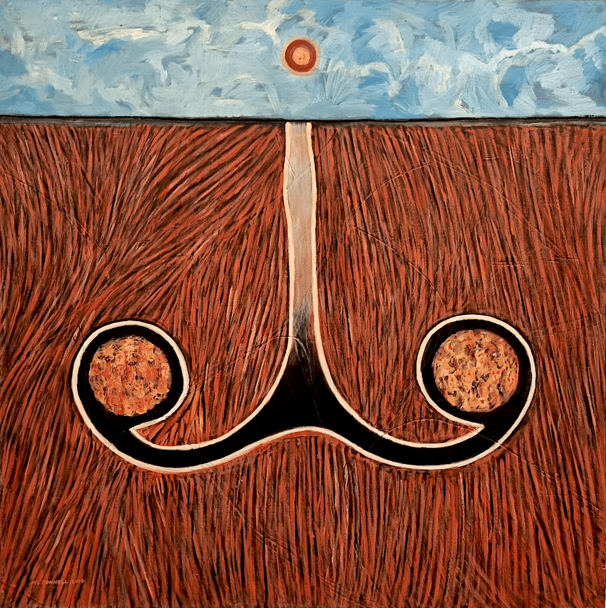 This painting is slightly surreal and a little bit whimsical. It shows a cross section of the Earth with fallopian tubes. Above the horizon is a living cell. Has it just come from the earth…or going in? I have left this piece quite ambiguous so that the viewing can decide for themselves.