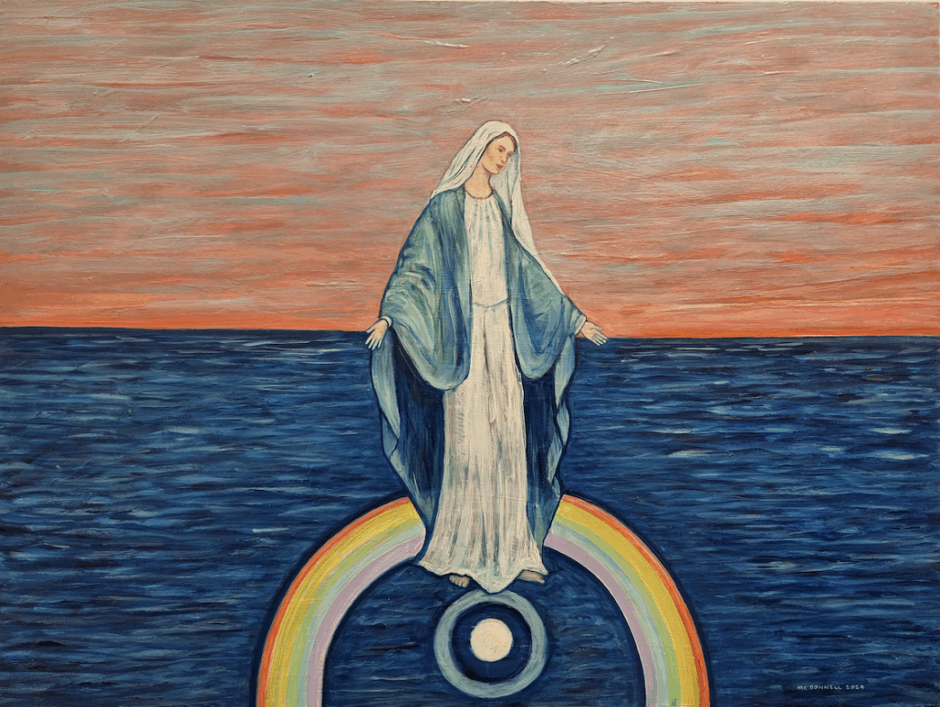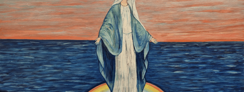 “Mary over the ocean” was inspired by the beauty and brevity of our lives. Not a religious painting, more of an homage to goodness and choosing the righteous path.
